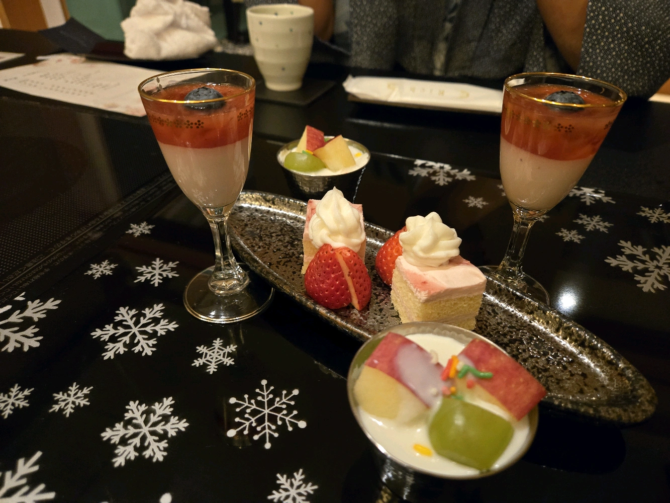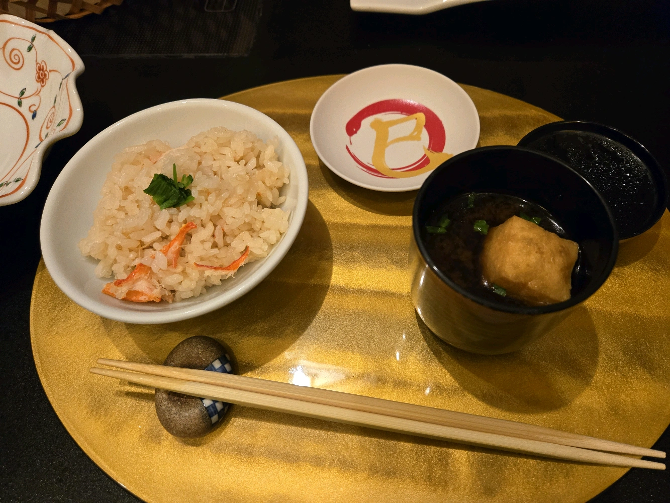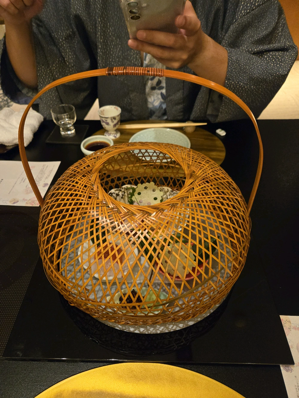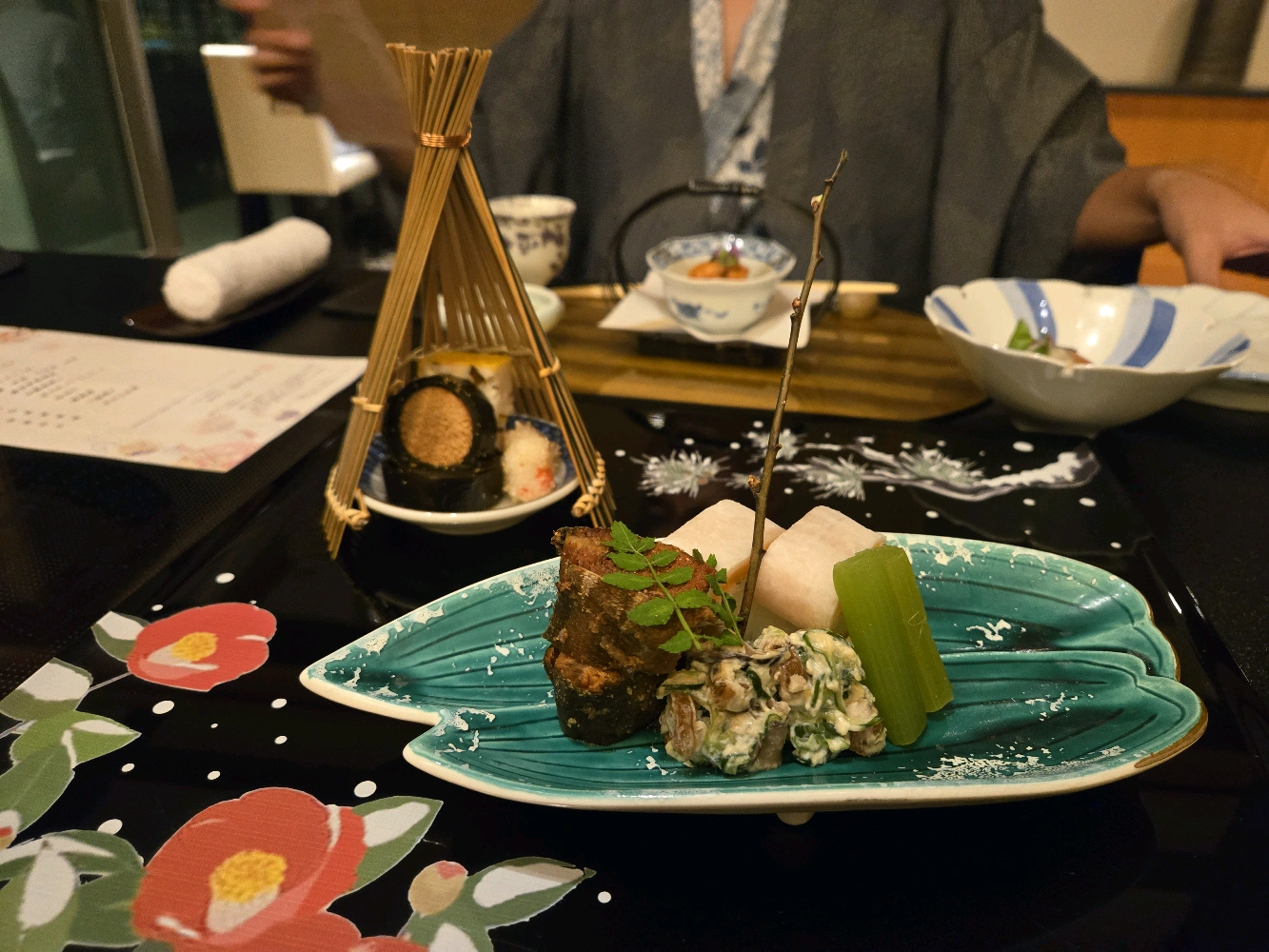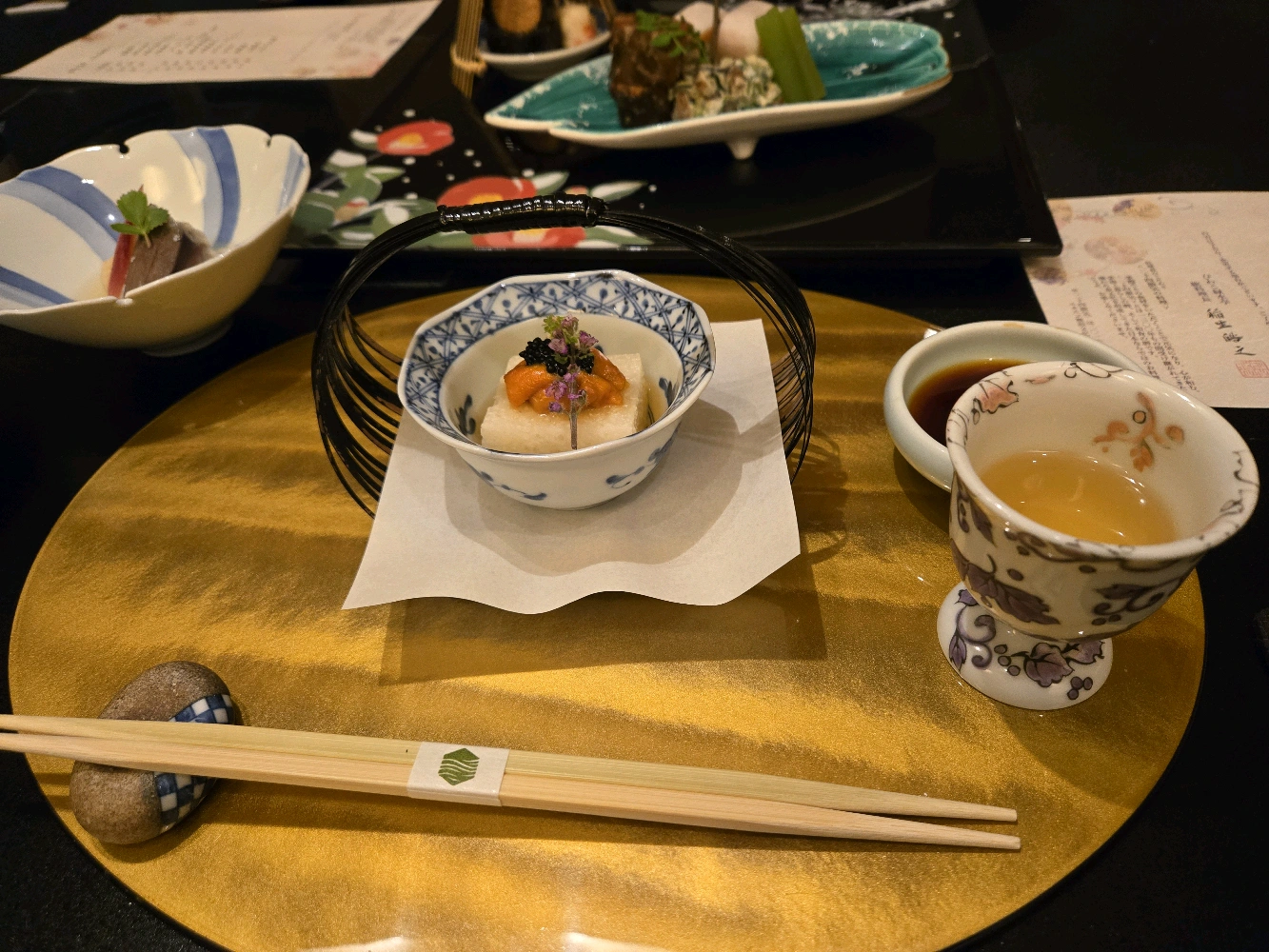 睦月膳 御品書き 睦月:日本舊曆的一月(正月)名稱,睦 むつき =和睦,帶有家人團聚、年初的溫馨氛圍。 使用當季食材(「二十四節氣料理」概念),希望讓人感受到季節變化、提供傳統日本料理的細膩風味。 / 🥂 ① 食前酒+先付(開場) 一開始的食前酒是檸檬風味,但其實是無酒精飲料,有點像氣泡飲的清爽感。這種設計還滿貼心的,就算不喝酒的人也可以一起進入用餐節奏。(孕婦友善! 先付「養老豆腐」,是一種用山藥泥(或山藥+高湯)做成像豆腐口感的料理。吃起來比想像中更細緻,上面再放上海膽和魚子,整體味道很柔。 / 🍱 ② 季節前菜拼盤 綠色葉片型瓷盤+後面小帳篷那道 內容大概是: 燉魚、白蘿蔔、青菜拌物(白和え)、魚卵壽司捲(小帳篷內)。 / 🐟 ③ 造里 四種盛り よんしゅもり 竹籃打開那組,是比較偏「原味呈現」的刺身拼盤,包含深紅色的鮪魚、粉白色的真鯛(或鰤魚)、花枝捲鮭魚卵。 裝飾:雪花蓮藕片(呼應一月冬雪)、紫蘇花穗、現磨生芥末。 あしらい 配角 / 擺盤配料 ・包含紫蘇葉、蘿蔔絲、檸檬片、花、葉子,或一些小配菜。 ・功能是提味(例如去腥)、增加層次、美觀。 一式(いっしき)= 一整套/全部 配料可能會依季節而不同,所以直接寫「一式」,就不用一個一個列出來。 / 🧺 ④ 向付 白色花型碗 是鯖魚和干貝的組合,搭配小町蕪(こまちかぶ,日本小白蘿蔔的一種)和茗荷(みょうが,日本薑,那片紅紫色的尖尖配菜)一起吃,味道比想像中有層次。 鯖魚的油脂比較重,但中間穿插一些清爽的配料,吃起來反而不會膩。 / 🍶 ⑤ 焼物 燒物是鰆的味噌幽庵燒,旁邊搭配玉子燒一起吃,味道多了一點甜味的平衡。 味噌幽庵焼(ゆうあんやき),一種日式經典燒法,醃料通常是:醬油、味醂、酒、柑橘(柚子或橙),有時會加味噌。 / 🍲 ⑥ 蒸物(甘鯛蒸し) 白肉魚甘鯛 上面搭一點山葵 清湯系 是一道偏冬季感的料理,以白肉魚(甘鯛)為主,口感很細緻,帶一點溫和的滑順感。 / 🥩 ⑦ 主角:近江牛しゃぶしゃぶ 日本三大和牛之一 (另外兩個是神戶牛、松阪牛) 來到滋賀縣琵琶湖這一帶, 一定要吃近江牛。 牛肉油花很漂亮,涮一下入口就化。 那一刻真的會覺得, 前面的鋪陳就是為了這一口😆 是說不知道為什麼桌上會出現「鮎のなれずし」(熟成香魚壽司)這個小立牌,但我完全沒印象有吃到😆 / 🍚 ⑧ 食事 蟹肉炊飯(釜炊き御飯) 赤出汁(紅味噌湯) 香物(漬物)三種盛り 炊飯帶著淡淡的高湯清甜。 中間那個白色小碟子上有一個金色的「巳」字,代表當年的生肖,很有收藏感。 / 🍧 ⑨ 水物(甜點) 草莓蛋糕+鮮奶油 水果(蘋果、葡萄)+ 布丁 草莓系慕斯 本來以為會是很日式的簡單小甜點,沒想到直接來一整套甜點拼盤,有夠驚喜😆 / 2026.04.06 回顧整理。 雖然是去年才去的,但不知道為什麼體感已經過了不只一年🥺