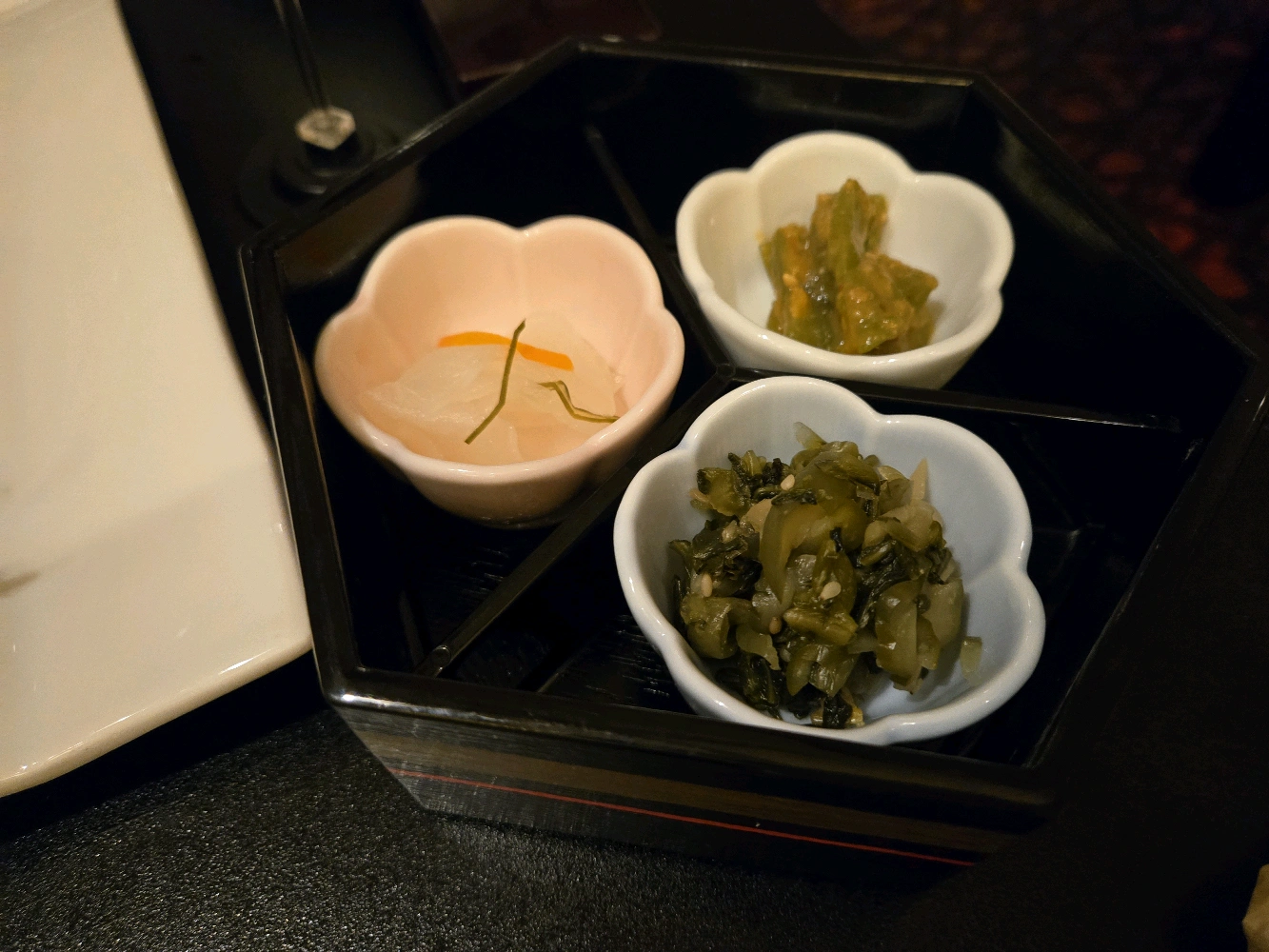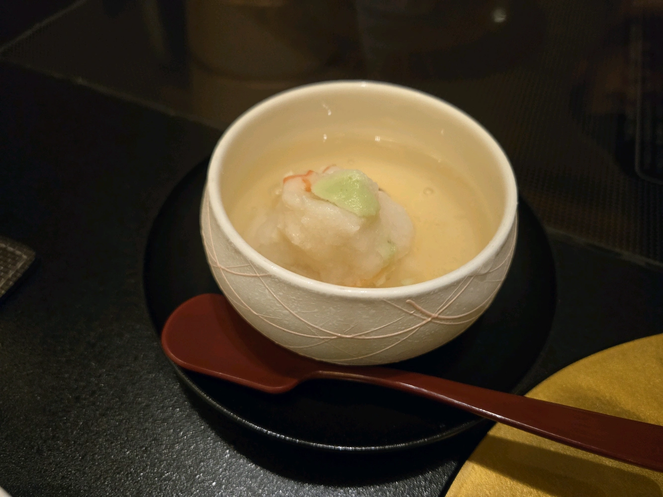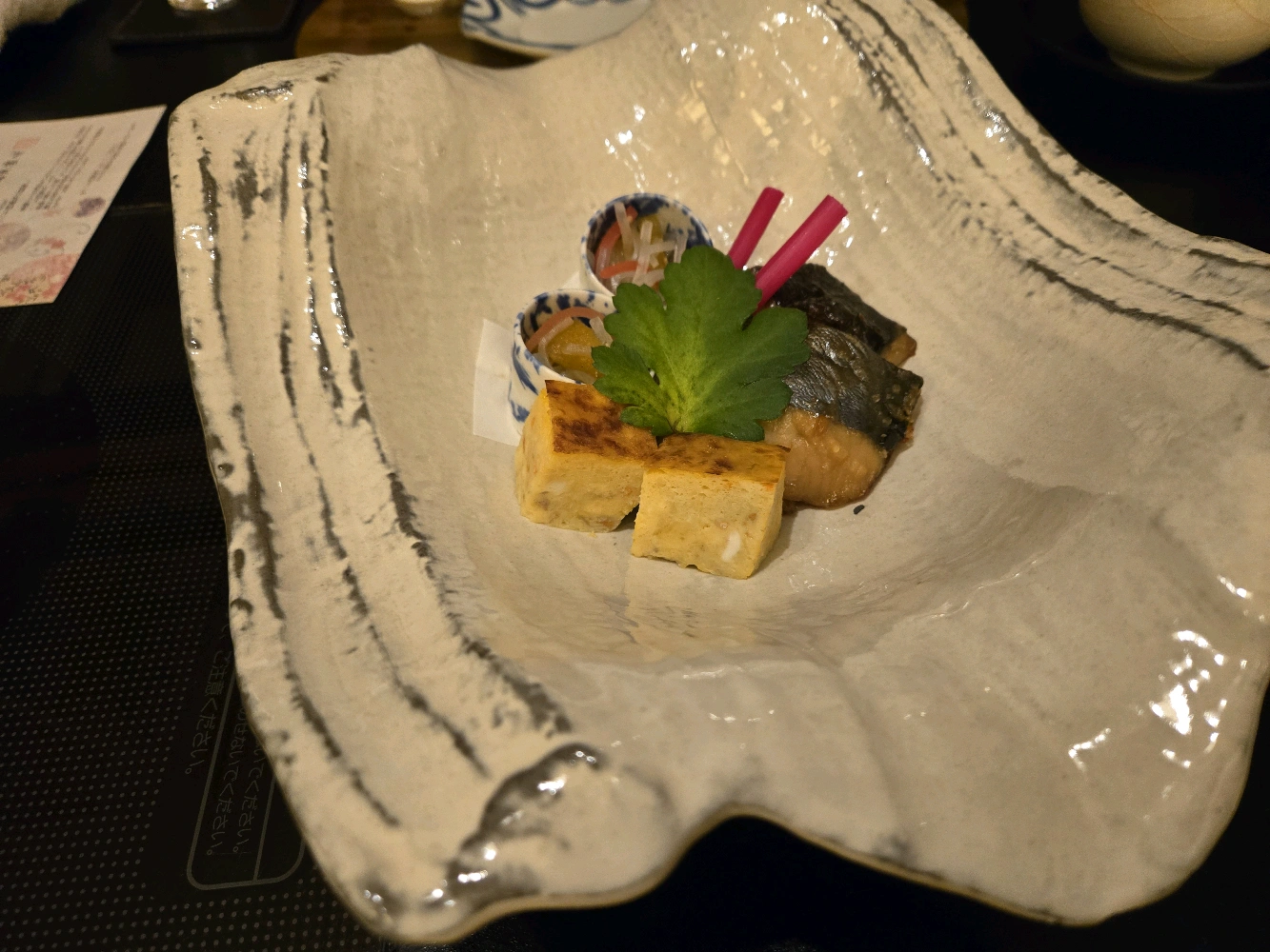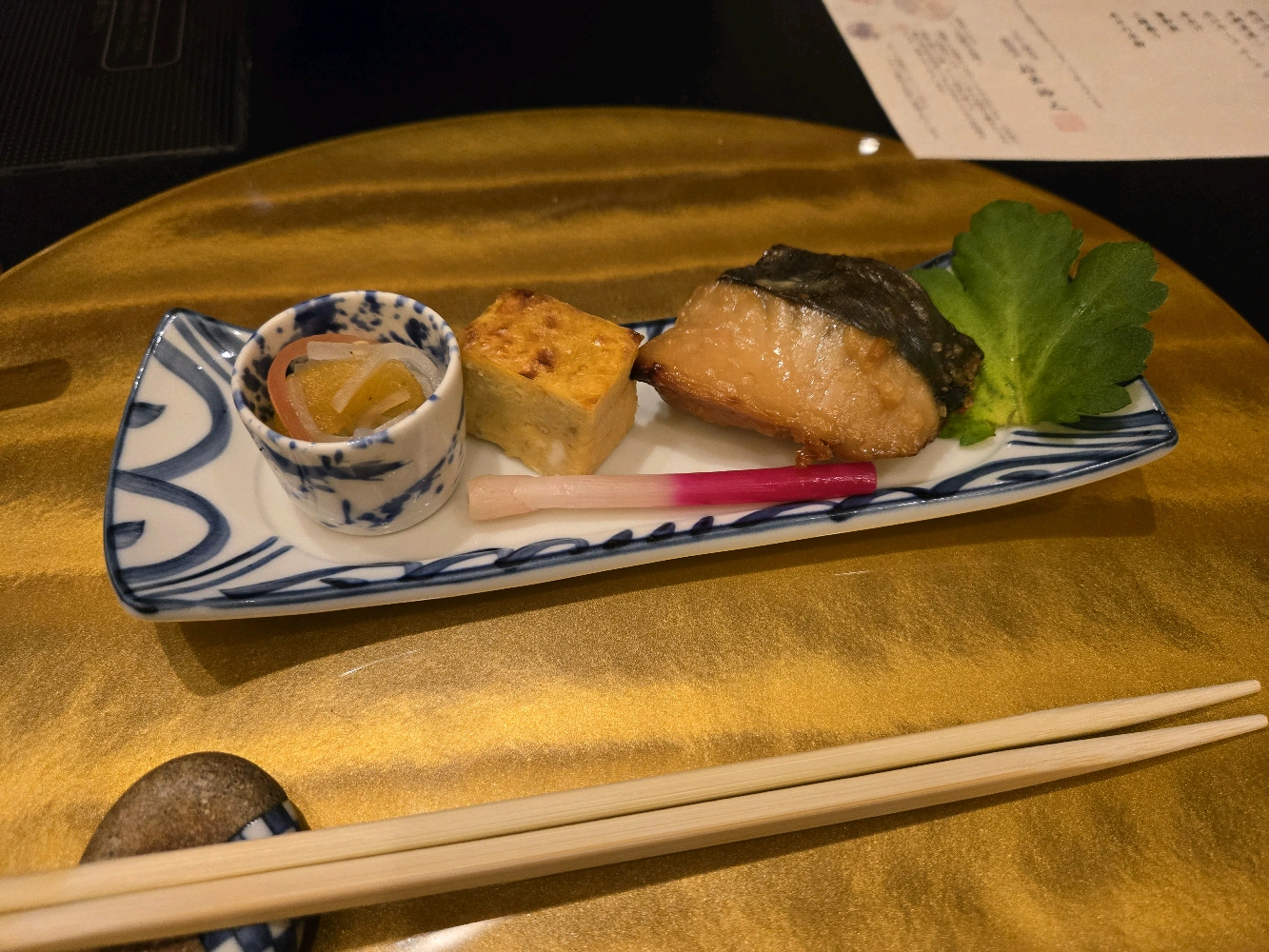 睦月膳 御品書き 睦月:日本舊曆的一月(正月)名稱,睦 むつき =和睦,帶有家人團聚、年初的溫馨氛圍。 使用當季食材(「二十四節氣料理」概念),希望讓人感受到季節變化、提供傳統日本料理的細膩風味。 / 🥂 ① 食前酒+先付(開場) 一開始的食前酒是檸檬風味,但其實是無酒精飲料,有點像氣泡飲的清爽感。這種設計還滿貼心的,就算不喝酒的人也可以一起進入用餐節奏。(孕婦友善! 先付「養老豆腐」,是一種用山藥泥(或山藥+高湯)做成像豆腐口感的料理。吃起來比想像中更細緻,上面再放上海膽和魚子,整體味道很柔。 / 🍱 ② 季節前菜拼盤 綠色葉片型瓷盤+後面小帳篷那道 內容大概是: 燉魚、白蘿蔔、青菜拌物(白和え)、魚卵壽司捲(小帳篷內)。 / 🐟 ③ 造里 四種盛り よんしゅもり 竹籃打開那組,是比較偏「原味呈現」的刺身拼盤,包含深紅色的鮪魚、粉白色的真鯛(或鰤魚)、花枝捲鮭魚卵。 裝飾:雪花蓮藕片(呼應一月冬雪)、紫蘇花穗、現磨生芥末。 あしらい 配角 / 擺盤配料 ・包含紫蘇葉、蘿蔔絲、檸檬片、花、葉子,或一些小配菜。 ・功能是提味(例如去腥)、增加層次、美觀。 一式(いっしき)= 一整套/全部 配料可能會依季節而不同,所以直接寫「一式」,就不用一個一個列出來。 / 🧺 ④ 向付 白色花型碗 是鯖魚和干貝的組合,搭配小町蕪(こまちかぶ,日本小白蘿蔔的一種)和茗荷(みょうが,日本薑,那片紅紫色的尖尖配菜)一起吃,味道比想像中有層次。 鯖魚的油脂比較重,但中間穿插一些清爽的配料,吃起來反而不會膩。 / 🍶 ⑤ 焼物 燒物是鰆的味噌幽庵燒,旁邊搭配玉子燒一起吃,味道多了一點甜味的平衡。 味噌幽庵焼(ゆうあんやき),一種日式經典燒法,醃料通常是:醬油、味醂、酒、柑橘(柚子或橙),有時會加味噌。 / 🍲 ⑥ 蒸物(甘鯛蒸し) 白肉魚甘鯛 上面搭一點山葵 清湯系 是一道偏冬季感的料理,以白肉魚(甘鯛)為主,口感很細緻,帶一點溫和的滑順感。 / 🥩 ⑦ 主角:近江牛しゃぶしゃぶ 日本三大和牛之一 (另外兩個是神戶牛、松阪牛) 來到滋賀縣琵琶湖這一帶, 一定要吃近江牛。 牛肉油花很漂亮,涮一下入口就化。 那一刻真的會覺得, 前面的鋪陳就是為了這一口😆 是說不知道為什麼桌上會出現「鮎のなれずし」(熟成香魚壽司)這個小立牌,但我完全沒印象有吃到😆 / 🍚 ⑧ 食事 蟹肉炊飯(釜炊き御飯) 赤出汁(紅味噌湯) 香物(漬物)三種盛り 炊飯帶著淡淡的高湯清甜。 中間那個白色小碟子上有一個金色的「巳」字,代表當年的生肖,很有收藏感。 / 🍧 ⑨ 水物(甜點) 草莓蛋糕+鮮奶油 水果(蘋果、葡萄)+ 布丁 草莓系慕斯 本來以為會是很日式的簡單小甜點,沒想到直接來一整套甜點拼盤,有夠驚喜😆 / 2026.04.06 回顧整理。 雖然是去年才去的,但不知道為什麼體感已經過了不只一年🥺